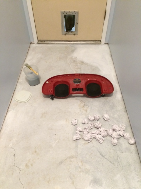 This phase of the project started several weeks ago, before everything got real dirty. I used concrete patch stuff to...wait for it...patch the concrete. Only where the carpet tack strips left holes; no need to patch cracks or anything before papering.